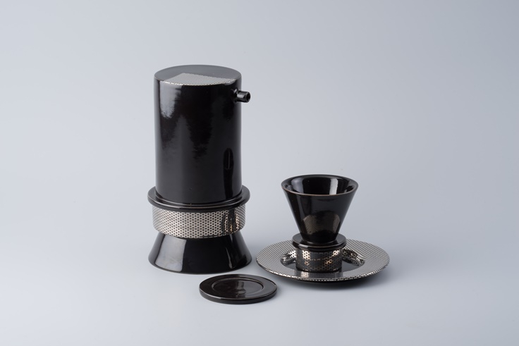 Attēlā: viens no izstādes eksponātiem - priekšmeti no tējas servīzes “Suprimeļi”. Tehniskais porcelāns, pigmentēta glazūra, virsglazūras dekors: dekols, platinizācija. Formas un dekora autors Āris Segliņš. Rīga, Latvija, 2014. Rīgas pašvaldības kultūras iestāžu apvienības Rīgas Porcelāna muzeja kolekcija.