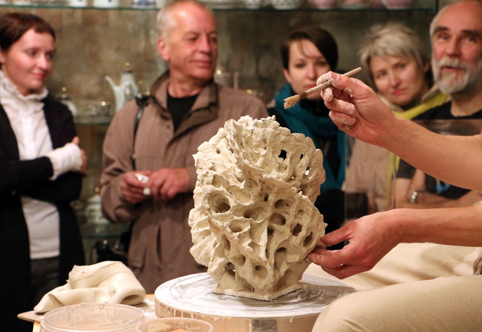 Pēteris Martinsons - izcilākais un populārākais Latvijas keramiķis atpazīstams ne tikai Latvijā, bet arī ārpus tās. Martinsona izsmalcinātā spēja pārvērst ikvienu keramikas materiālu konceptuālā mākslas darbā ir augstākais meistarības paraugs. Tāpat kā Klīdzēja lieliskā virpošanas prasme apvienojumā ar aizraujošu stāstījumu sniedz apmeklētājiem nebijušu mākslas baudījumu. Elīna Titāne pazīstama kā viena no izcilākajām meistarēm Latvijas mūsdienu keramikā. „Baltajā naktī” māksliniece veidoja vienu no saviem izsmalcinātajiem, spīdošajiem porcelāna mākslas darbiem.