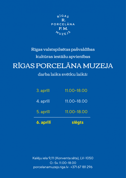 Rīgas Porcelāna muzejs Lielā Piektdienā un Pirmās Lieldienās būs vaļā: 3.aprīlī 2026 - 11.00-18.00 4.aprīlī 2026 - 11.00-18.00 5.aprīlī 2026 - 11.00-18.00 6.aprīlī 2026 - SLĒGTS