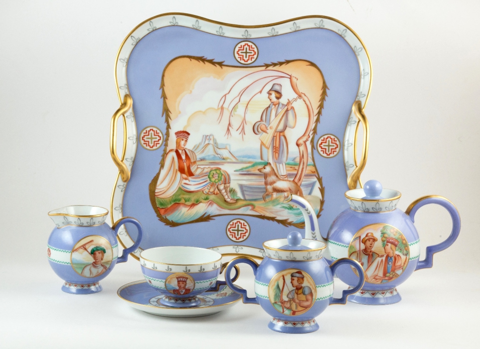 Attēlā: Priekšmeti no servīzes “Darbs un atpūta”. Apgleznojums pēc Romana Sutas meta. A/S “M.S.Kuzņecovs” Porcelāna, fajansa un māla izstrādājumu fabrika. 1938.