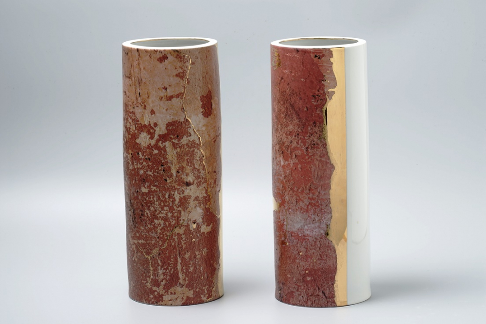Porcelāns, polihroms virsglazūras apgleznojums, autortehnika: spalvas zīmējums, digitālio un komerciālo dekolu kolāža, krāsas klājums, reljefā pasta, lustrējums un zeltījums 12% Au.